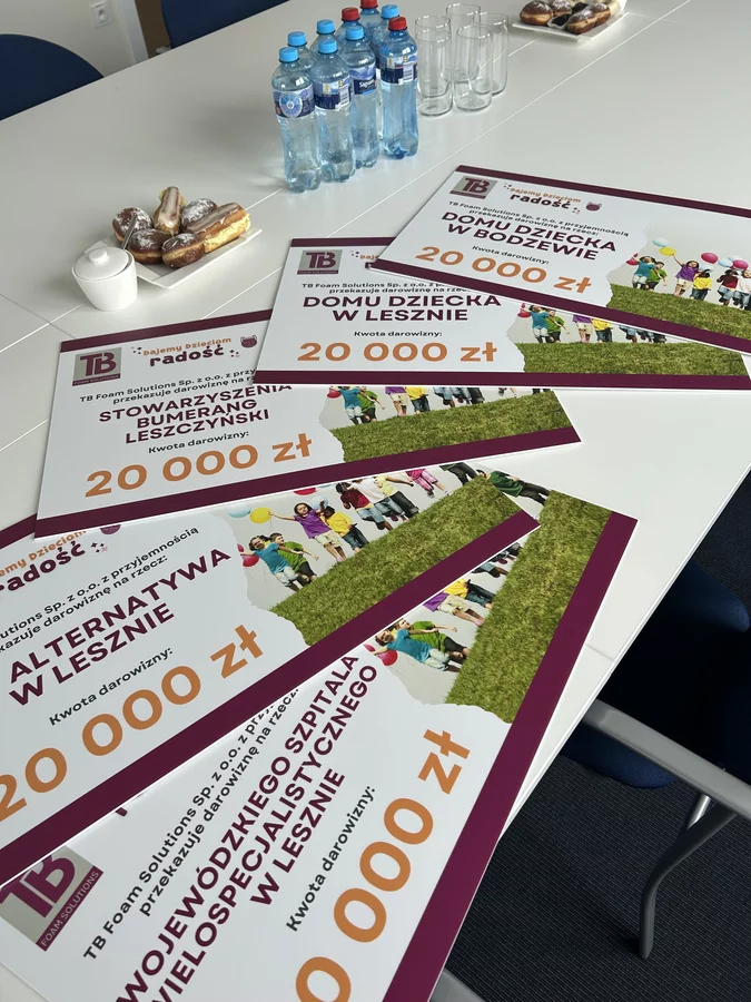 Inicjatywa spotkała się z dużym zrozumieniem i życzliwością zaproszonych gości, którzy z ogromną otwartością zaangażowali się w akcję, przekazując znaczne środki finansowe. Zebrana kwota została dodatkowo wsparta przez samego właściciela, dzięki czemu możliwe było udzielenie pomocy aż 5 placówkom wśród których znaleźli się: Wojewódzki Szpital Wielospecjalistyczny im. Jana Jonstona w Lesznie, Dom Dziecka im. Świętej Rodziny w Lesznie, Stowarzyszenie Bumerang Leszczyński, Stowarzyszenie „Nasza Alternatywa” w Lesznie, Dom Dziecka w Bodzewie i Gostyniu. Symboliczne czeki wręczył Pan Thomas Busskamp w siedzibie firmy TB Foam Solutions. Obdarowane placówki wykorzystają środki m.in. na zakup sprzętu medycznego, pokrycie kosztów leczenia dzieci z niepełnosprawnościami oraz sfinansowanie zajęć dla dzieci i młodzieży w zakresie ich edukacji, rozwoju ich pasji oraz uzdolnień.