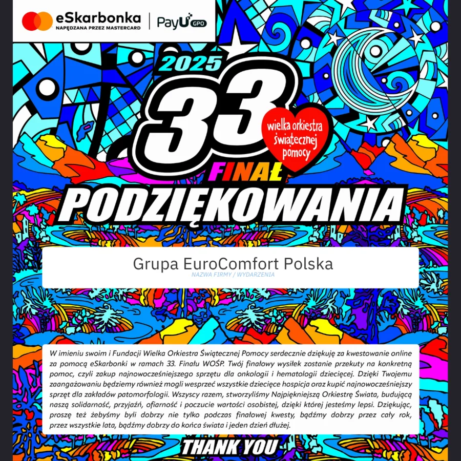 Pod takim hasłem odbył się 33. Finał Wielkiej Orkiestry Świątecznej Pomocy. Z wielką radością ponownie dołączyliśmy do tej niezwykłej inicjatywy, która w minioną niedzielę zjednoczyła w grze i pomaganiu dla szczytnego celu całą Polskę. To niezwykłe wydarzenie pokazuje, jak wiele możemy osiągnąć, gdy działamy razem.